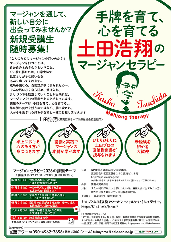 Home » 未分類 » 手牌を育て、心を育てる 土田浩翔のマージャンセラピー2026